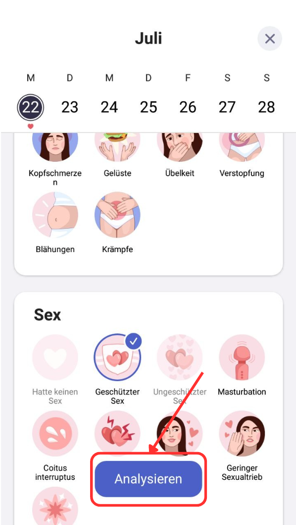 Um Ihre Symptome zu bearbeiten, öffnen Sie einfach die Registerkarte Symptome und wählen Sie die Antworten aus, die Sie bearbeiten möchten. Tippen Sie anschließend auf 'Analysieren'.