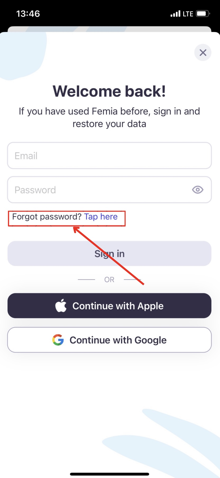 If you used your email and password to register in the app but forgot your password, please tap on the ‘Tap here’ hyperlink as shown in the following screenshot and follow the instructions provided.