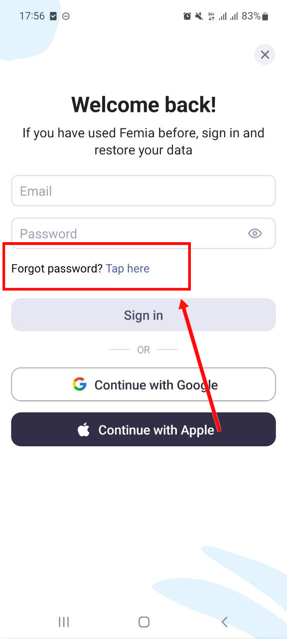 If you used your email and password to register in the app but forgot your password, please tap on the ‘Tap here’ hyperlink as shown in the following screenshot and follow the instructions provided.